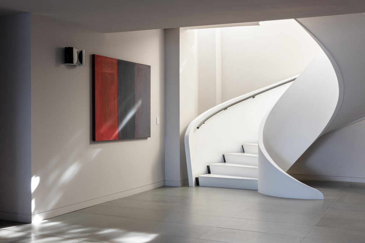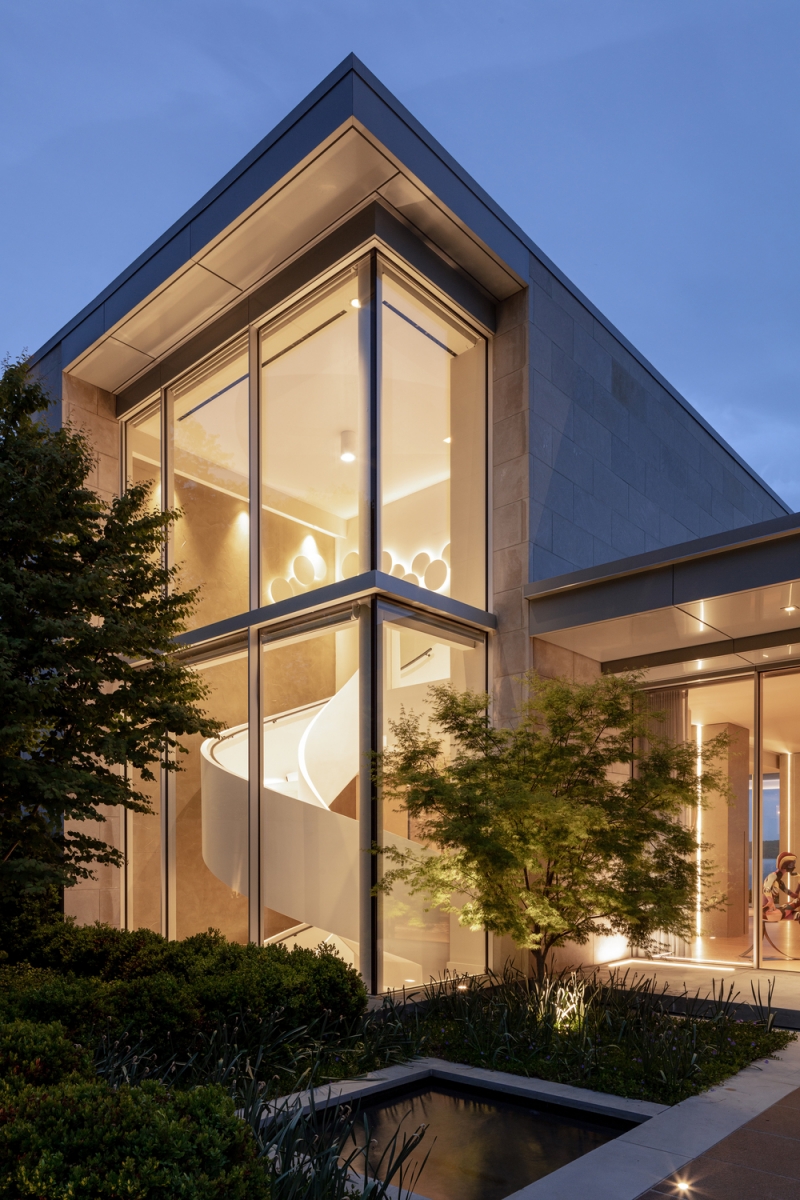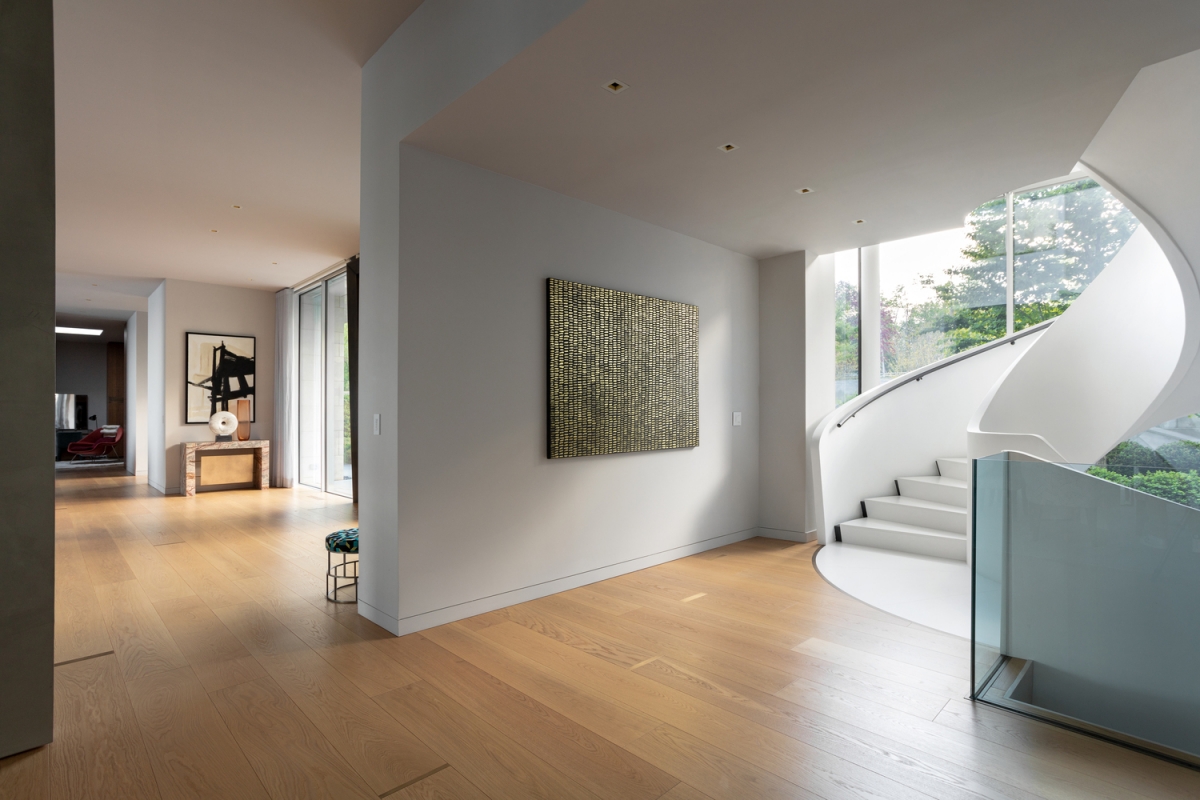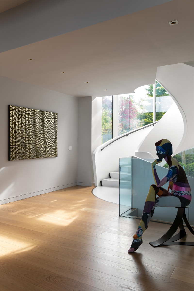 As linhas onduladas da exuberante vegetação de Long Island envolvem suavemente a sofisticada moradia de três pisos. Os dois níveis acima do solo e o piso subterrâneo são ligados por uma escada helicoidal — uma obra de engenharia projetada e construída em Itália pela Edilco Scale — que representa o verdadeiro ícone da arquitetura fluida da habitação.