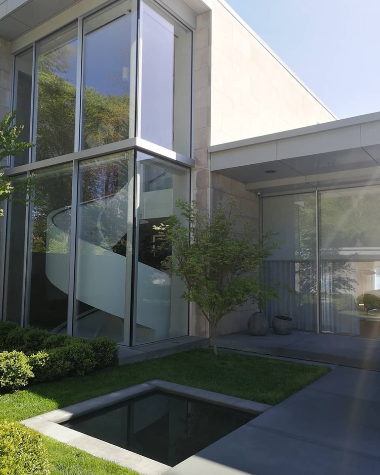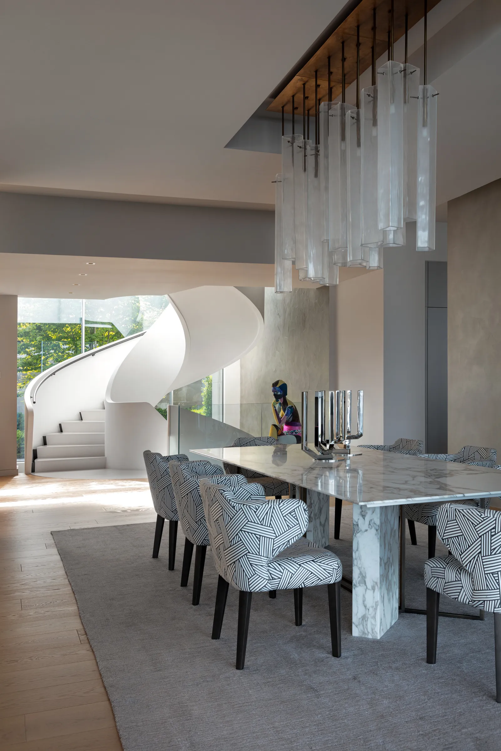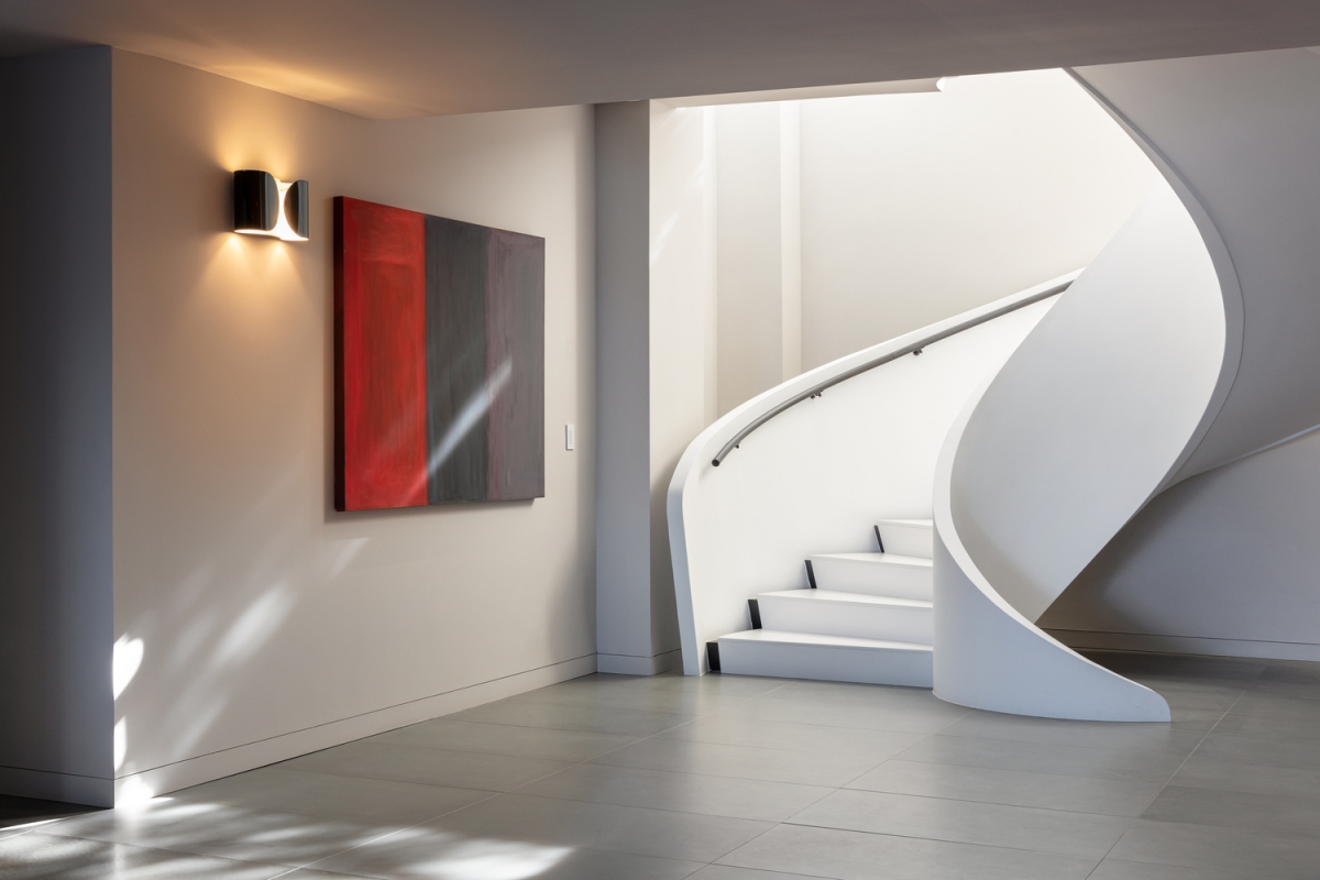 As linhas onduladas da exuberante vegetação de Long Island envolvem suavemente a sofisticada moradia de três pisos. Os dois níveis acima do solo e o piso subterrâneo são ligados por uma escada helicoidal — uma obra de engenharia projetada e construída em Itália pela Edilco Scale — que representa o verdadeiro ícone da arquitetura fluida da habitação.
