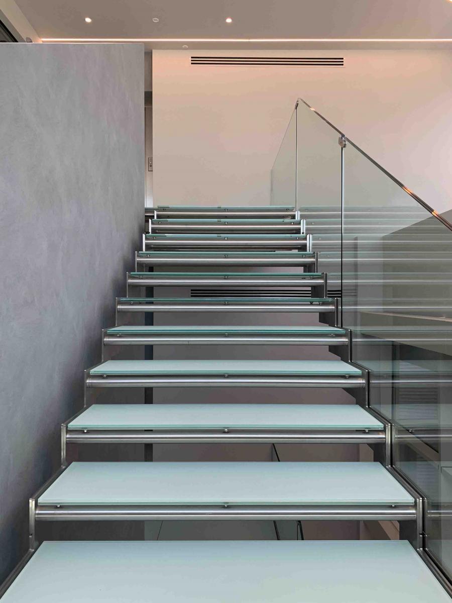 The treads were manufactured using acid-etched tempered float glass to eliminate the perception of void while ascending or descending, while simultaneously conveying a sense of lightness. In response to the client’s request to avoid visible joints between the glass panels of the four landings, each landing was designed using only two large-format slabs, ensuring visual uniformity and material continuity.