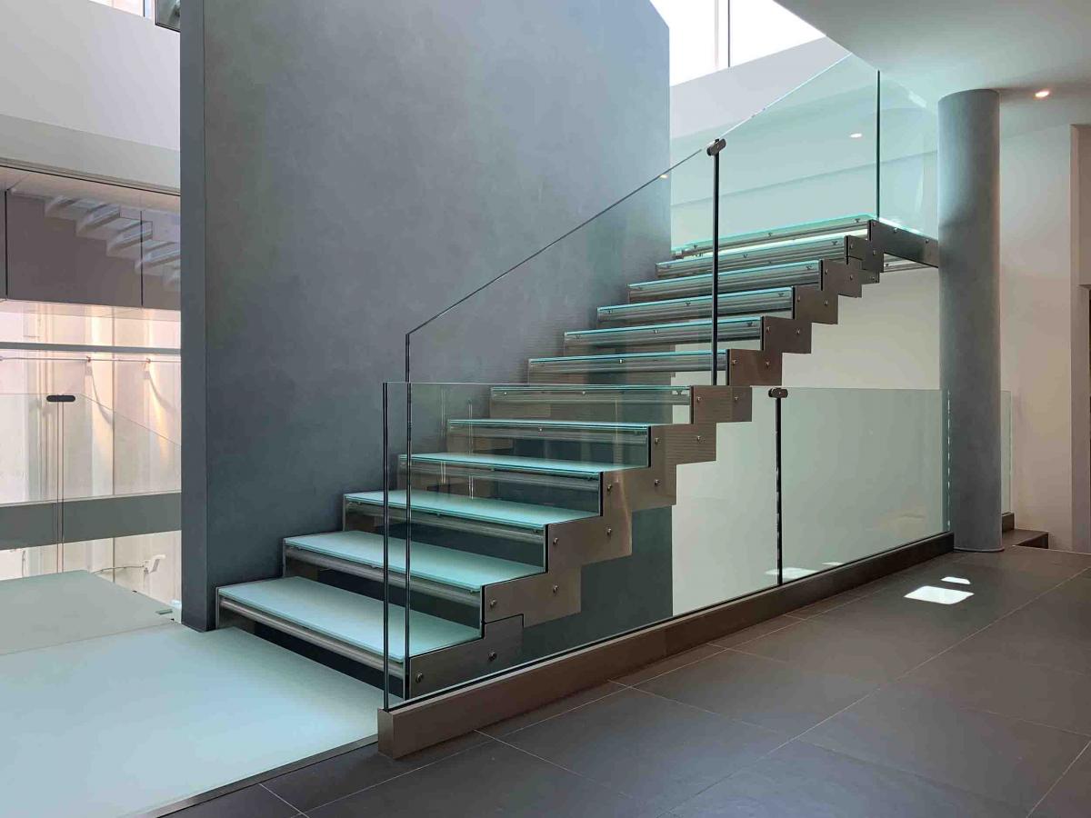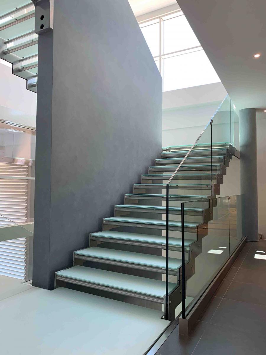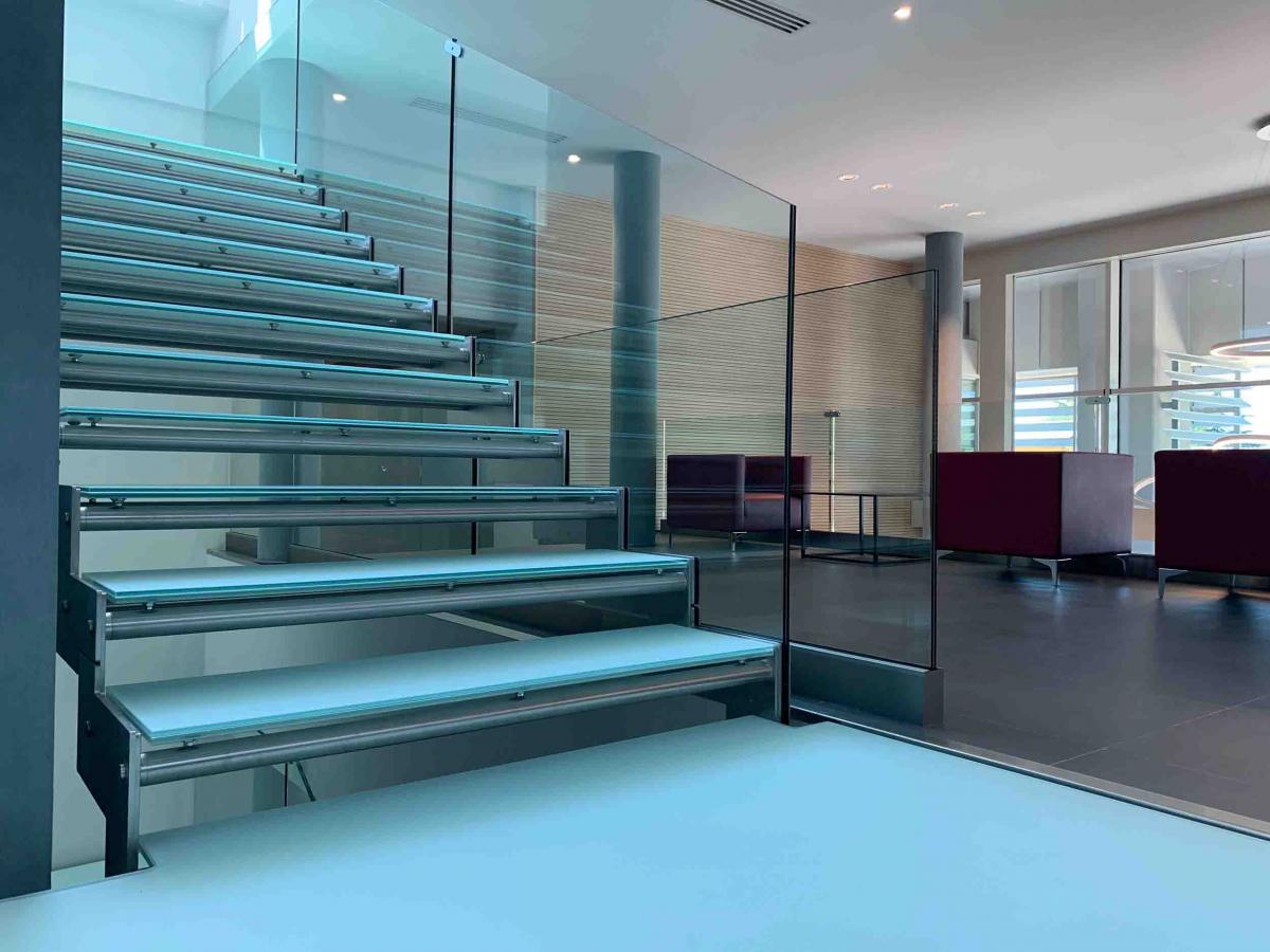 Glass was also selected for the balustrade, with a different surface finish. While acid-etched tempered float glass was specified for the treads to enhance slip resistance and visual comfort, transparent tempered float glass was chosen for the balustrade to emphasize the structure’s aesthetic appeal.