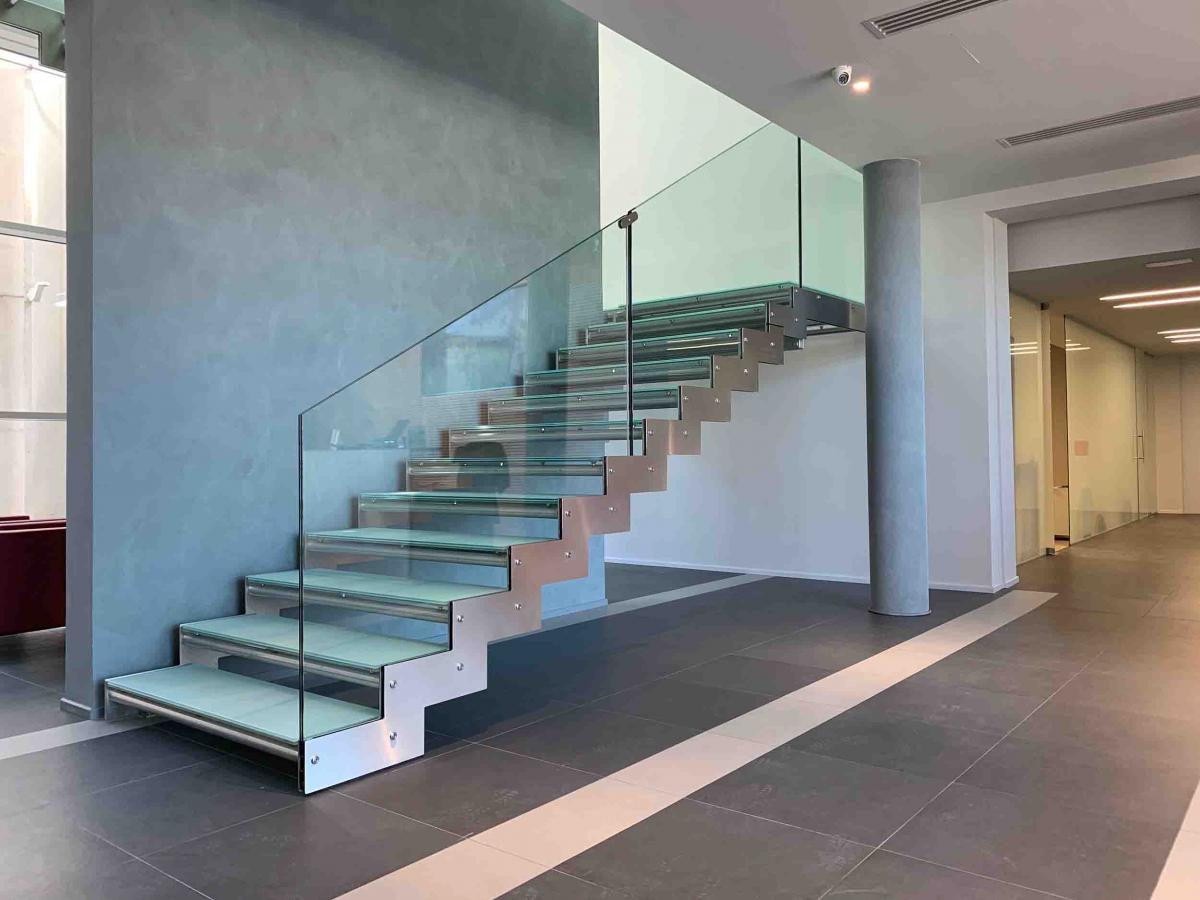 This fully AISI 304 stainless steel stair from the E-TR line was installed at the entrance of a corporate complex in Tuscany, designed to connect the company’s various office levels. The curved, transparent glass balustrade enhances spatial perception, amplifying natural light and allowing the structure to be appreciated in its entirety.